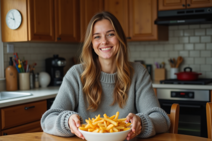 Femme canadienne souriante dégustant une poutine dans la cuisine
